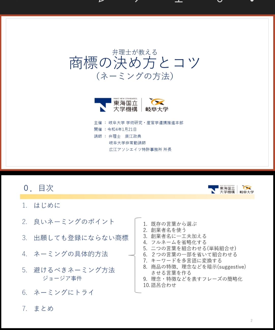 2022年1月 岐阜大学知財セミナー【商標】弁理士が教える『商標の決め方とコツ(ネーミングの方法)』